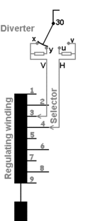 - contact schakelt naar stand y - u: nu staan de weerstanden parallel en in serie met de belasting. De weerstand van de schakelaar is dus . Omdat er nu een gesloten kring is van wikkeling 3 - 4 vloeit er een circulatiestroom die beperkt wordt door de weerstand . De spanning is nu een halve stapspanning gezakt.