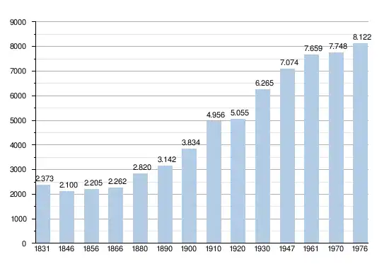 - Bronnen:NIS, Opm:1831 tot en met 1970=volkstellingen; 1976 = inwoneraantal op 31 december