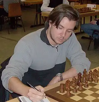 1.d4 Pf6 2.c4 g6 3.Pc3 d5 4.cxd5 Pxd5 5.e4 Pxc3 6.bxc3 Lg7 7.Pf3 c5 8.Tb1 0-0 9.Le2 cxd4 10.cxd4 Da5+ 11.Ld2 Dxa2 12.0-0 Lg4 13.Lg5 De6 14.h3 Lxf3 15.Lxf3 Dd7 16.d5 Pa6 17.De2 Pc5 18.e5 Tae8 19.Tfd1 f6 20.Le3 Tc8 21.d6 b6 22.Lxc5 Txc5 23.e6 Dc8 24.dxe7 Te8 25.Td8 Txd8 26.exd8D+ Dxd8 27.e7 De8 28.De6+ Kh8 29.Td1 Tc8 30.Dxc8 Dxc8 31.Td8+, zwart geeft op
