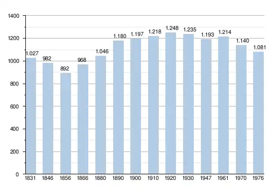 - Bronnen:NIS, Opm:1831 tot en met 1970=volkstellingen; 1976 = inwoneraantal op 31 december