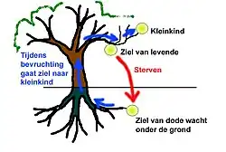 - Als men stierf, ging de ziel naar een soort wachtruimte onder de aarde.[1] In dat dodenrijk wachtten de zielen van de gestorvenen tot ze terug konden keren in het lichaam van een van hun kleinkinderen.[2]