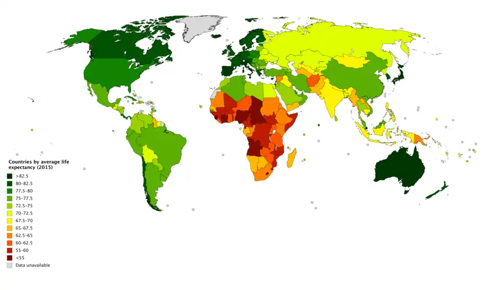 De levensverwachting is wereldwijd tussen 2000 en 2015 met gemiddeld 5 jaar gestegen, de snelste toename sinds de jaren 1960. De levensverwachting neemt echter niet altijd toe. Gedurende de jaren 1990 nam de levensverwachting in bepaalde delen van de wereld af, bijvoorbeeld in Afrika door de Aids epidemie aldaar en in veel voormalige Sovjet-landen (met name Rusland) door het ineenstorten van de Sovjet-Unie. De toename van de levensverwachting tussen 2000 en 2015 was het grootst in Afrika. In 2015 is de levensverwachting van vrouwen in Japan het hoogste, namelijk 86,8 jaar. In Zwitserland is de levensverwachting voor mannen het hoogste met 81,3 jaar. In Sierra Leone is de levensverwachting zowel voor mannen als voor vrouwen het laagste van de hele wereld, namelijk 50,8 voor vrouwen en 49,3 voor mannen.[5]