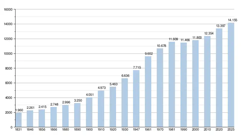 - Bronnen:NIS, Opm:1831 tot en met 1981=volkstellingen; 1990 en later= inwonertal op 1 januari