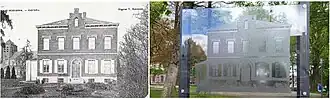 Links de oorspronkelijke pastorie, rechts de illusie geschonken door Vlaamse Kring Liedekerke.