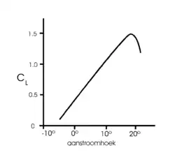 In figuur 2 is de liftcoëfficiënt als functie van de aanstroomhoek gegeven. De aanstroomhoek (angle of attack) is de hoek die onbeïnvloede stroming maakt met de koorde van de vleugel (lijn van voorkant naar achterkant vleugel). heeft voor veel profielen, zoals dat van figuur 1, al een positieve waarde bij aanstroomhoek 0°. Dat komt doordat de stroming over de gebogen achterkant al naar onder wordt afgebogen als de koorde van de vleugel evenwijdig met de stroming staat. Bij een bepaalde kritische hoek (10 à 20°) neemt de liftkracht plotseling zeer sterk af. Vliegtuigen mogen deze toestand van overtrek normaal gesproken niet bereiken. De curve is specifiek voor een bepaald profiel, maar heeft voor goede ontwerpen wel altijd ongeveer deze vorm.