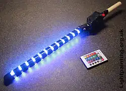 Twee voorbeelden van verlichting: een ronddraaiende poi en een eigenhandig gefabriceerde Digital Light Wand