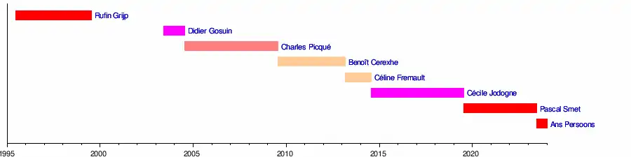 | Nr. | Minister | Partij | Begin | Einde | Regering(en) | |||