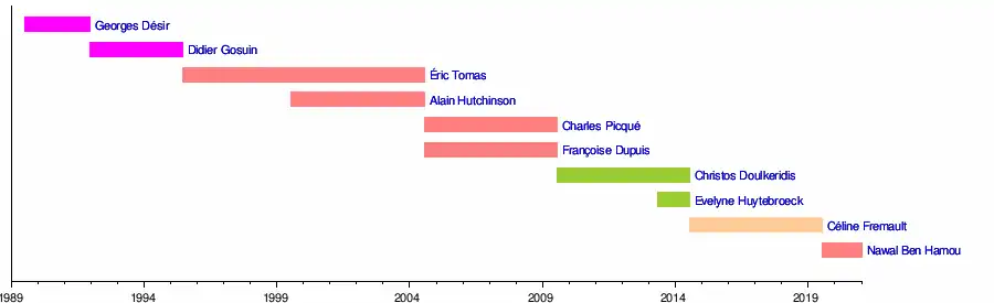 PS | 15 juli 1999 | 19 juli 2004 | Simonet I, de Donnea, Ducarme, Simonet II | Huisvesting/ Sociale Huisvesting | |