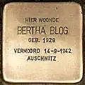 HIER WOONDE JOKE BLOCH GEB. 1935 GEDEPORTEERD 1942 UIT WESTERBORK VERMOORD 18-7-1942 AUSCHWITZ |
