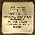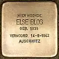 HIER WOONDE HARTOG BLITZ GEB. 1910 GEDEPORTEERD 1943 NAAR WESTERBORK VERMOORD 31-7-1944 AUSCHWITZ |
