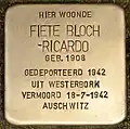 HIER WOONDE FIETE BLOCH- RICARDO GEB. 1908 GEDEPORTEERD 1942 UIT WESTERBORK VERMOORD 18-7-1942 AUSCHWITZ |
