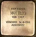 HIER WOONDE LEO BLOCH GEB. 1905 GEDEPORTEERD 1942 UIT WESTERBORK VERMOORD 20-8-1942 AUSCHWITZ |
