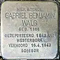 HIER WOONDE GABRIL BENJAMIN WALG GEB. 1868 GEDEPORTEERD 1943 UIT WESTERBORK VERMOORD 16.4.1943 SOBIBOR |