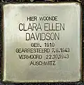 HIER WOONDE CLARA ELLEN DAVIDSON GEB. 1910 GEARRESTEERD 7.9.1943 VERMOORD 22.10.1943 AUSCHWITZ |