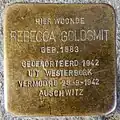 HIER WOONDE REBECCA GOLDSMIT GEB. 1883 GEDEPORTEERD 1942 UIT WESTERBORK VERMOORD 28-9-1942 AUSCHWITZ |