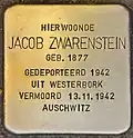 HIER WOONDE JACOB ZWARENSTEIN GEB. 1877 GEDEPORTEERD 1942 UIT WESTERBORK VERMOORD 13.11.1942 AUSCHWITZ |