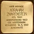 | HIER WOONDE AVRAM ZISE COHN GEB. 1904 GEDEPORTEERD 1944 UIT WESTERBORK BEZWEKEN 30-6-1944 MIDDEN-EUROPA |