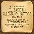 HIER WOONDE ELIZABETH ALLEMANS-HARTOGS GEB. 1888 GEDEPORTEERD 1942 UIT WESTERBORK VERMOORD 29.10.1942 AUSCHWITZ |