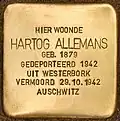 HIER WOONDE HARTOG ALLEMANS GEB. 1879 GEDEPORTEERD 1942 UIT WESTERBORK VERMOORD 29.10.1942 AUSCHWITZ |