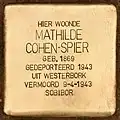 HIER WOONDE MATHILDE COHEN-SPIER GEB. 1869 GEDEPORTEERD 1943 UIT WESTERBORK VERMOORD 9-4-1943 SOBIBOR |