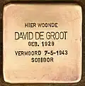 HIER WOONDE DAVID DE GROOT GEB. 1929 VERMOORD 7-5-1943 SOBIBOR |