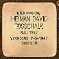 HIER WOONDE HEIMAN DAVID GOSSCHALK GEB. 1936 VERMOORD 7-5-1943 SOBIBOR |