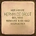 HIER WOONDE HERMAN DE GROOT GEB. 1894 VERMOORD 6-9-1942 MAUTHAUSEN |