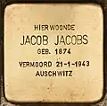 HIER WOONDE JACOB JACOBS GEB. 1874 VERMOORD 21-1-1943 AUSCHWITZ |