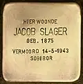 HIER WOONDE JACOB SLAGER GEB. 1875 VERMOORD 14-5-1943 SOBIBOR |