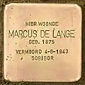 HIER WOONDE MARCUS DE LANGE GEB. 1875 VERMOORD 4-6-1943 SOBIBOR |