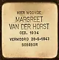 HIER WOONDE MARGREET VAN DER HORST GEB. 1934 VERMOORD 28-5-1943 SOBIBOR |
