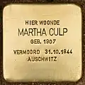 HIER WOONDE MARTHA CULP GEB. 1907 VERMOORD 31.10.1944 AUSCHWITZ |