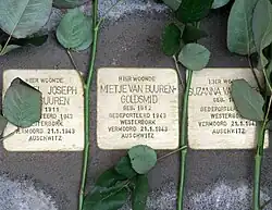 SAMUEL JOSEPH VAN BUUREN GEB. 1911 GEDEPORTEERD 1943 WESTERBORK VERMOORD 21.1.1943 AUSCHWITZ |