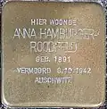 HIER WOONDE ANNA HAMBURGER- ROODFELD GEB. 1891 VERMOORD 8.10.1942 AUSCHWITZ |
