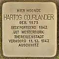 HIER WOONDE HARTOG COURLANDER GEB. 1875 GEDEPORTEERD 1942 UIT WESTERBORK THERESIENSTADT VERMOORD 11.12.1942 AUSCHWITZ |