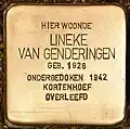 HIER WOONDE LINEKE VAN GENDERINGEN GEB. 1926 ONDERGEDOKEN 1942 KORTENHOEF OVERLEEFD |