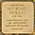 HIER WOONDE MAX MICHAEL BRESLAUER GEB. 1936 GEDEPORTEERD 1944 UIT WESTERBORK VERMOORD 21.10.1944 AUSCHWITZ |