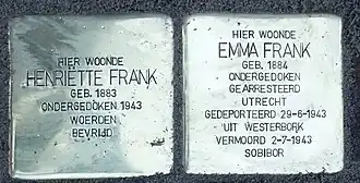 HIER WOONDE EMMA FRANK GEB. 1884 ONDERGEDOKEN GEARRESTEERD UTRECHT GEDEPORTEERD 29-6-1943 UIT WESTERBORK VERMOORD 2-7-1943 SOBIBOR |