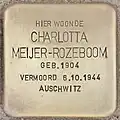 HIER WOONDE CHARLOTTA MEIJER-ROZEBOOM GEB. 1904 VERMOORD 6.10.1944 AUSCHWITZ |