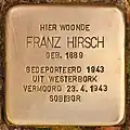 HIER WOONDE FRANZ HIRSCH GEB. 1889 GEDEPORTEERD 1943 UIT WESTERBORK VERMOORD 23.4.1943 SOBIBOR |