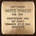 HIER WOONDE HARTOG BRANDON GEB. 1923 GEDEPORTEERD 1943 UIT VUGHT VERMOORD 27.12.1943 AUSCHWITZ |