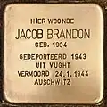HIER WOONDE JACOB BRANDON GEB. 1904 GEDEPORTEERD 1943 UIT VUGHT VERMOORD 24.1.1944 AUSCHWITZ |