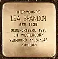 HIER WOONDE LEA BRANDON GEB. 1928 GEDEPORTEERD 1943 UIT WESTERBORK VERMOORD 11.6.1943 SOBIBOR |
