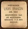HIER WOONDE LOUIS BRANDON GEB. 1938 GEDEPORTEERD 1943 UIT WESTERBORK VERMOORD 11.6.1943 SOBIBOR |