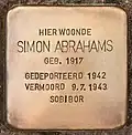 HIER WOONDE SIMON ABRAHAMS GEB. 1917 GEDEPORTEERD 1942 VERMOORD 9.7.1943 SOBIBOR |