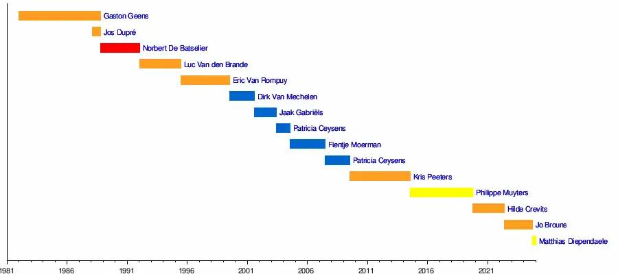 Matthias DiependaeleJo BrounsHilde CrevitsPhilippe MuytersKris Peeters (politicus)Patricia CeysensFientje MoermanPatricia CeysensJaak GabriëlsDirk Van MechelenEric Van RompuyLuc Van den BrandeNorbert De BatselierJos DupréGaston Geens