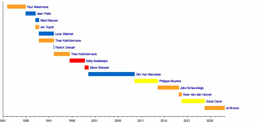 Minister-president · Viceminister-president · Begroting · Bestuurszaken · Binnenlandse Aangelegenheden · Brusselse Aangelegenheden · Buitenlands Beleid · Buitenlandse Handel · Cultuur · Economie · Energie · Financiën · Gezin · Huisvesting · Jeugd · Justitie · Landbouw · Leefmilieu · Media · Mobiliteit · Onderwijs · Openbare Werken · · Sport · Toerisme · Verkeer · Vlaamse Rand · Volksgezondheid · Vorming · Welzijn · Werkgelegenheid