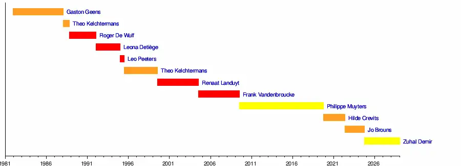 Minister-president · Viceminister-president · Begroting · Bestuurszaken · Binnenlandse Aangelegenheden · Brusselse Aangelegenheden · Buitenlands Beleid · Buitenlandse Handel · Cultuur · Economie · Energie · Financiën · Gezin · Huisvesting · Jeugd · Justitie · Landbouw · Leefmilieu · Media · Mobiliteit · Onderwijs · Openbare Werken · Ruimtelijke Ordening · Sport · Toerisme · Verkeer · Vlaamse Rand · Volksgezondheid · Vorming · Welzijn ·