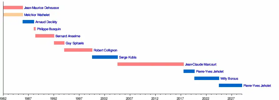 Waals Gewest: Minister-president · Begroting · Binnenlandse Aangelegenheden · Buitenlands Beleid · Buitenlandse Handel · · Financiën · Openbare Werken · Mobiliteit · Ruimtelijke Ontwikkeling · Werkgelegenheid