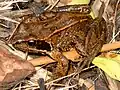 Echte kikkers | Algemeen | De bruine kikker is een van de algemeenste soorten in Nederland en België. De bruine kikker is te herkennen aan zijn driehoekige vlek achter het oog. De soort is moeilijk van de heikikker te onderscheiden maar wordt groter tot maximaal 11 centimeter. | ![]() |